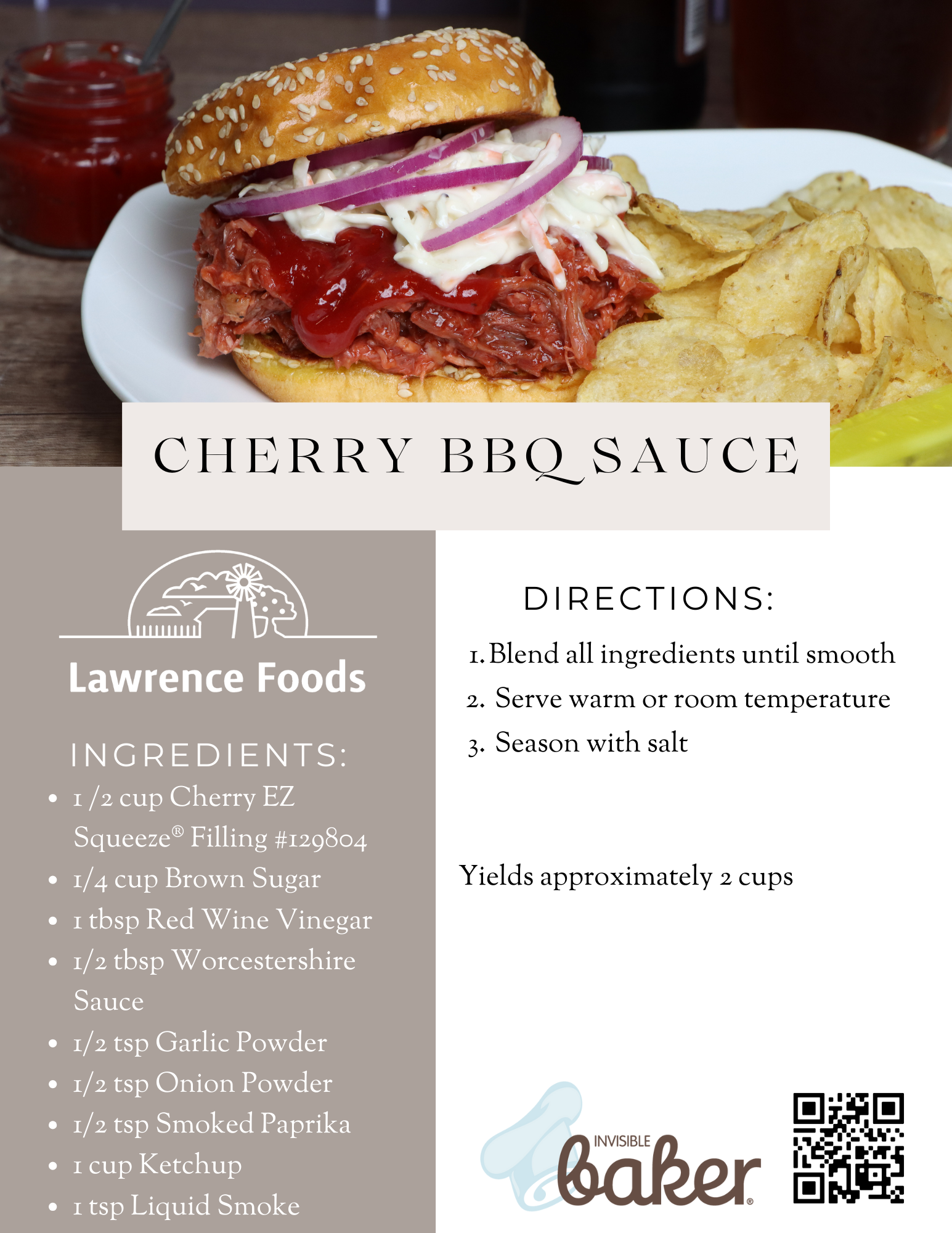 This smokey sweet BBQ sauce takes the delicious tart cherries of Lawrence Foods Deluxe Cherry Filling and combines them with the tang of BBQ sauce for a unique flavor. This thick tasty take on a sweet BBQ is the perfect pairing for pulled pork, wings, or even ribs.