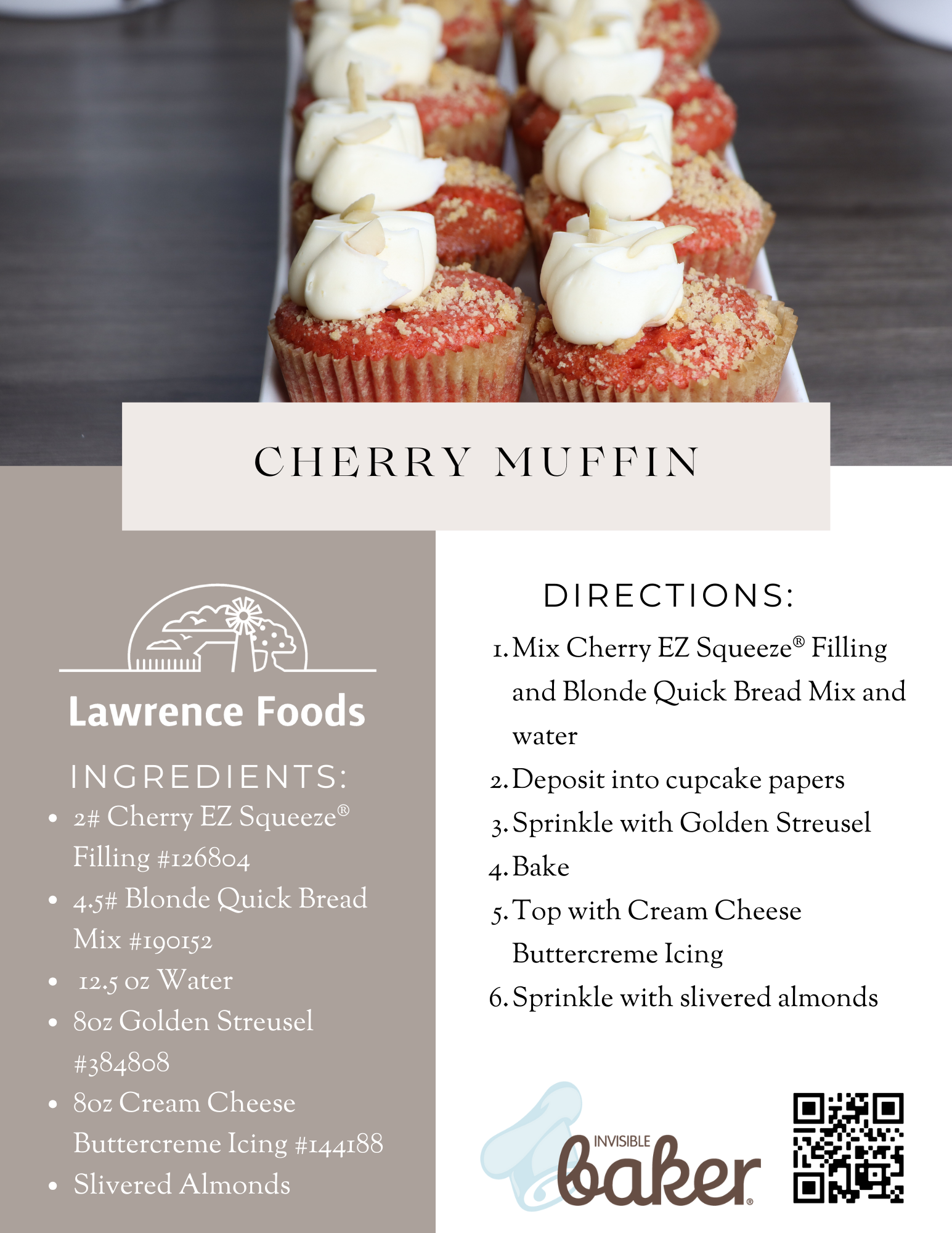 Is a muffin just cake for breakfast? I won’t tell if you won’t! Lawrence Foods Blonde mix is an easy to use base mix that produces moist and delicious quick breads and muffins. This cherry muffin has a tender crumb and fruity flavor that is an excellent pair to the tangy zing of Cream Cheese Buttercreme.