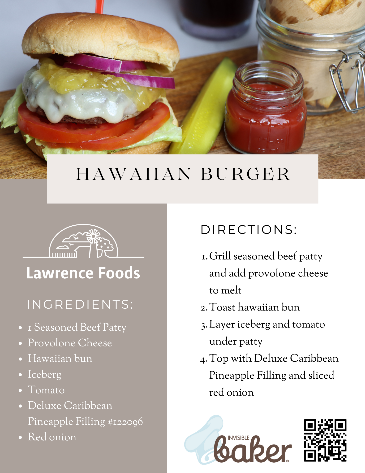 Classic sweet and salty flavor in this burger make it a real crowd pleaser at any cookout. Lawrence Foods Deluxe Caribbean Pineapple Filling brings the zesty zing of pineapple to a juicy patty to make a deliciously unique burger. This is an exceptionally easy burger to, just top and enjoy!