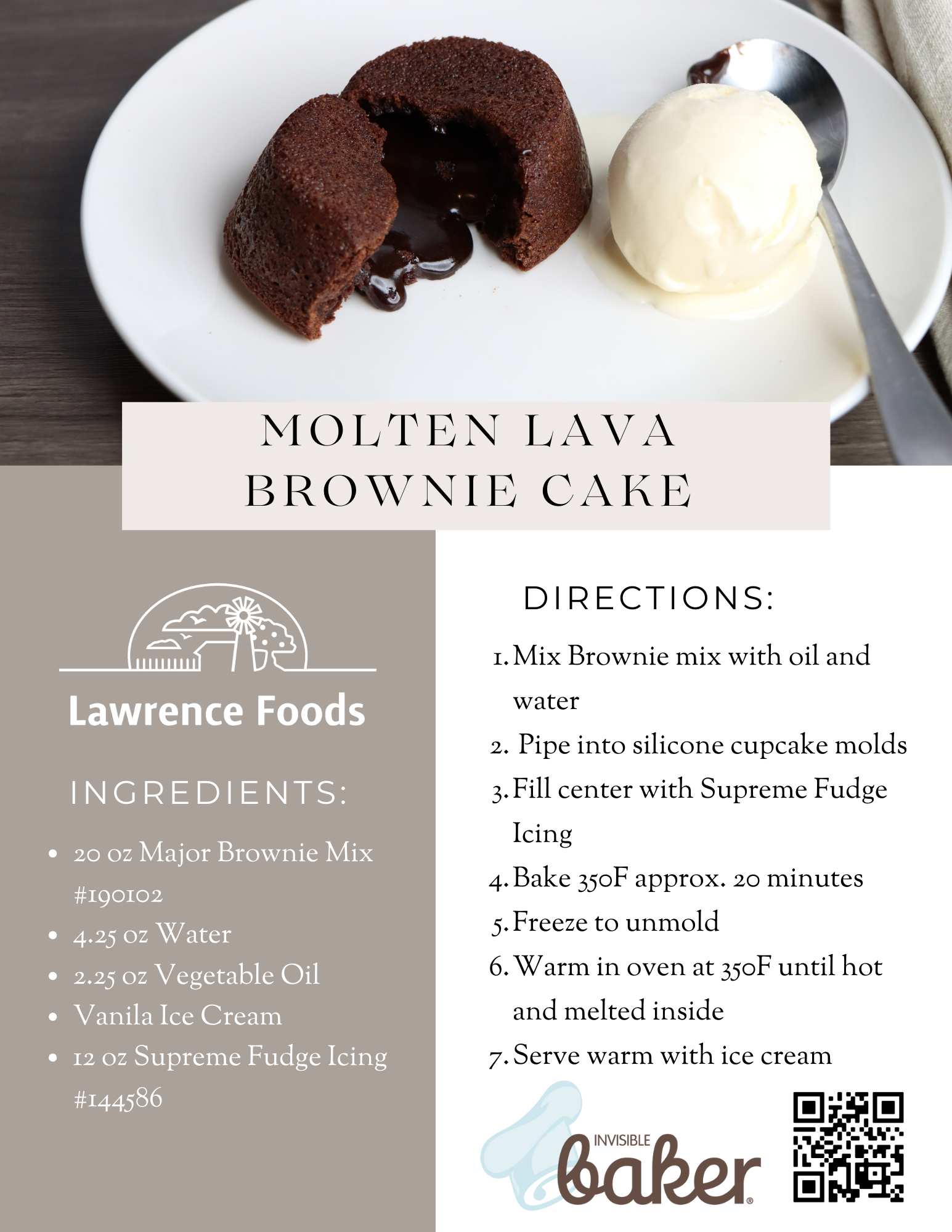 A classic warm decadent dessert, this Molten Brownie cake is a tender brownie with a warm liquid chocolate center. Lawrence Foods’ just add water brownie mix is an easy to use, delicious mix that makes these cakes as easy to make as they are to enjoy. They can even be made in advance and warmed up to order!
